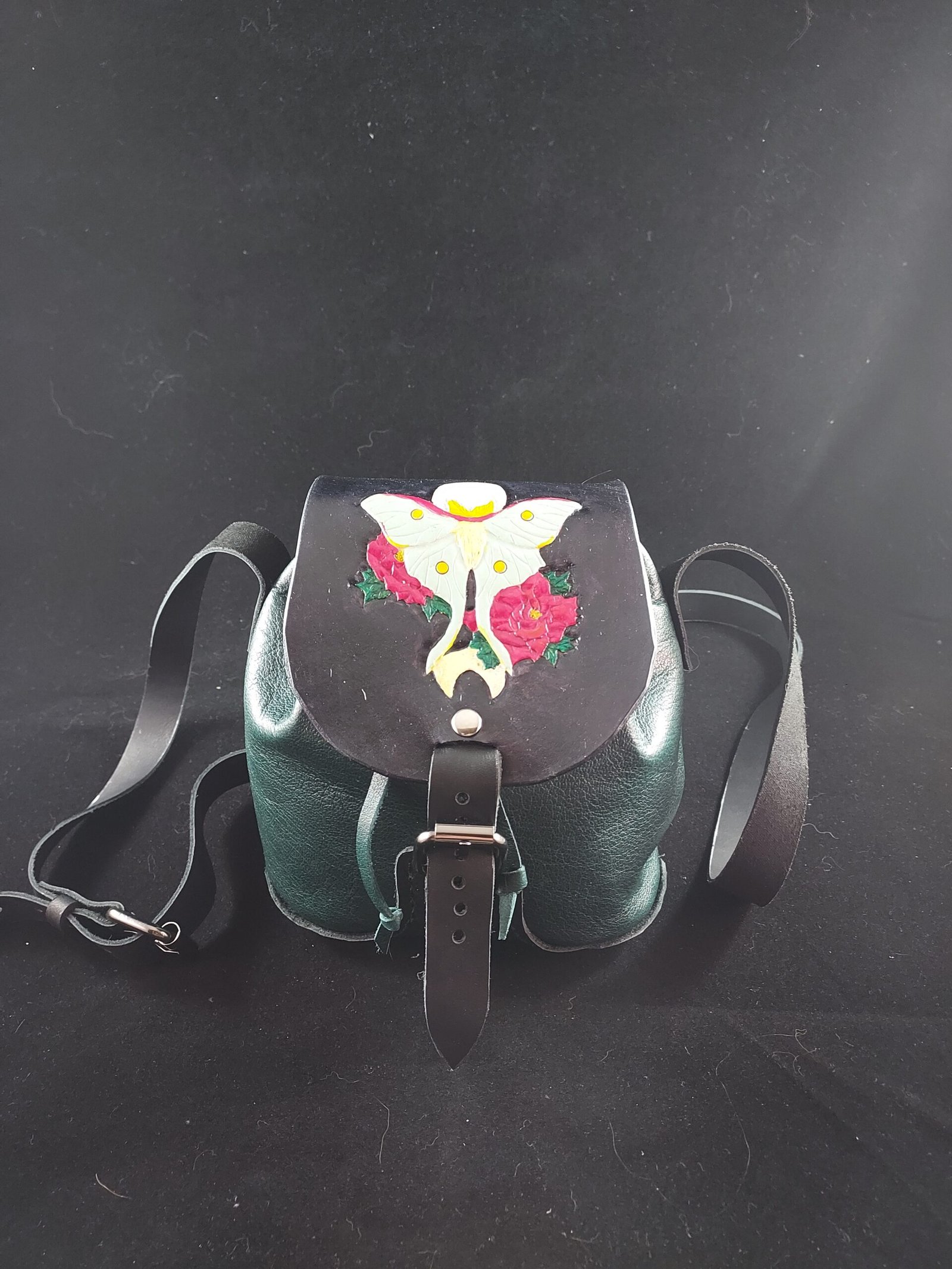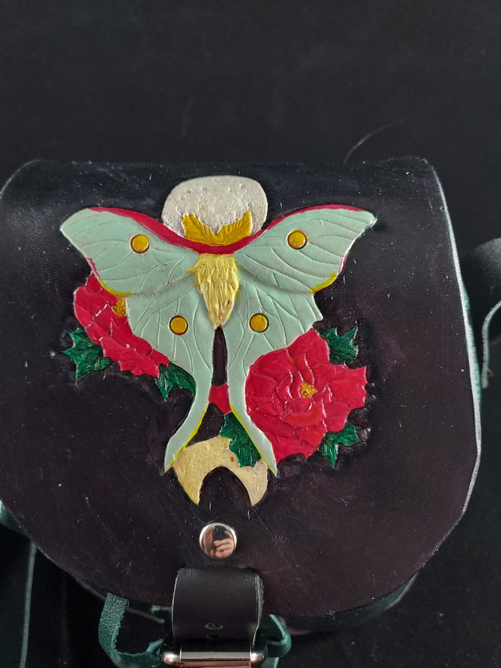Indulge in the beauty of artistry and functionality with our hand tooled, hand stitched, and hand painted leather handbag. This one-of-a-kind piece features a stunning depiction of a Luna moth nestled among peony flowers, adorned with delicate moon details. It’s more than a handbag—it’s a statement of timeless style and unmatched craftsmanship, perfect for elevating your everyday ensemble.